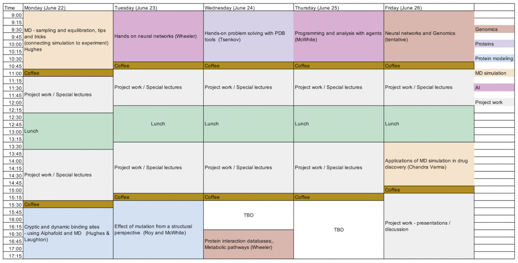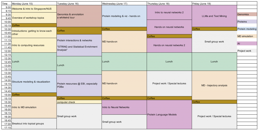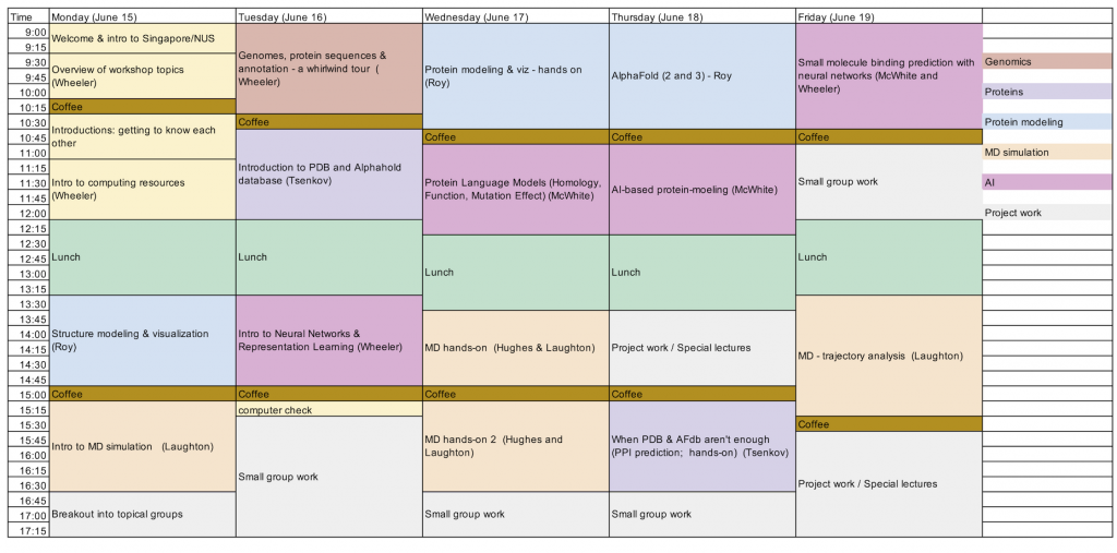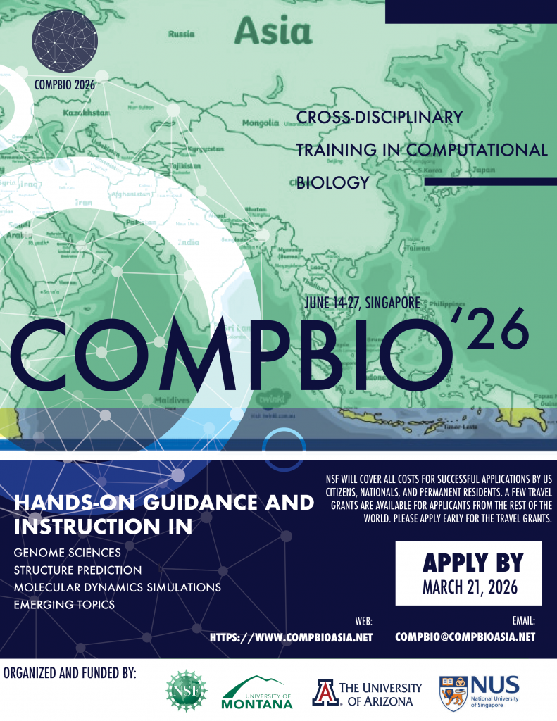 This two-week workshop consists of integrated lectures, hands-on training, and small-group projects. It was developed by researchers at the University of Montana and the University of Arizona and is hosted by National University of Singapore. The workshop features lecturers from across the globe with expertise in disciplines spanning artificial intelligence, genomics, proteomics, structural biology, and molecular dynamics.